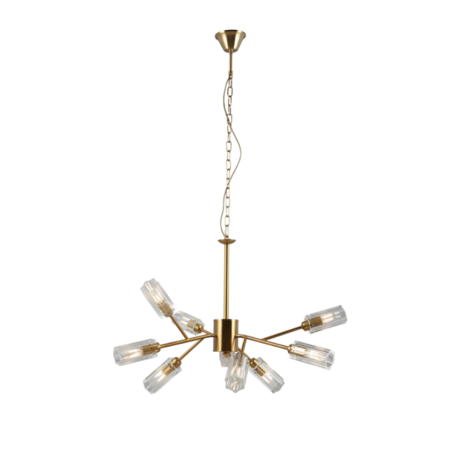 Pencahayaan kuat kilang berusia 10 tahun dari China menyesuaikan pelan perkhidmatan untuk saluran perolehan yang berbeza dari candelier emas kaca 9-cahaya ini:
